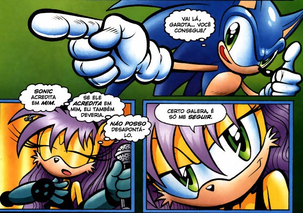 | Enquanto isso, Sonic consegue improvisar um show para Mina. |